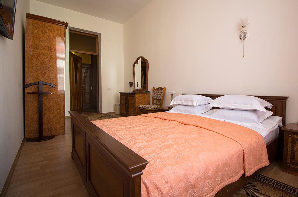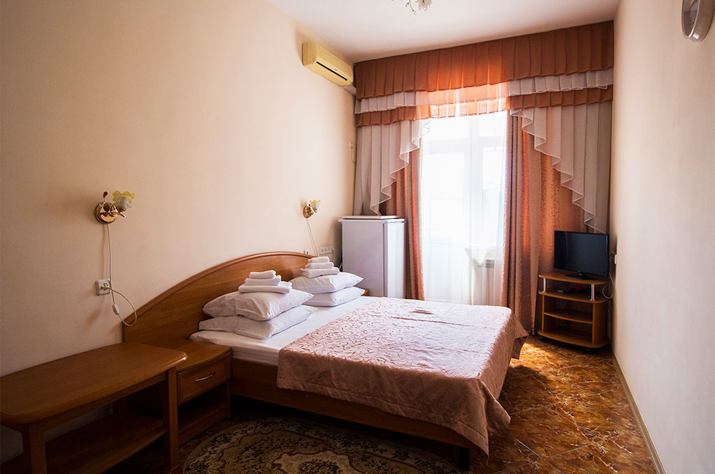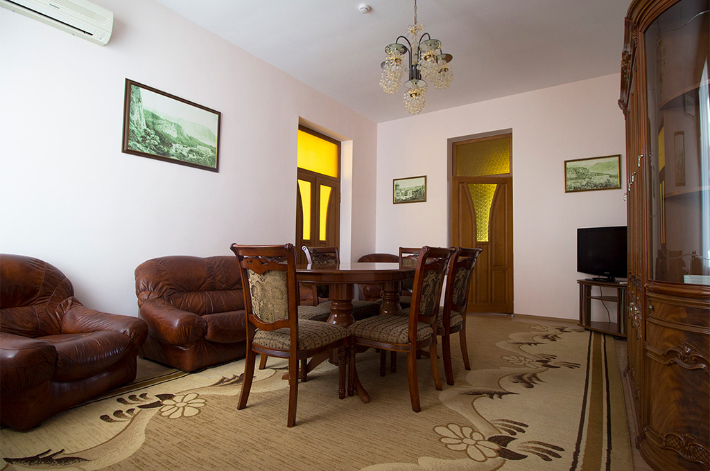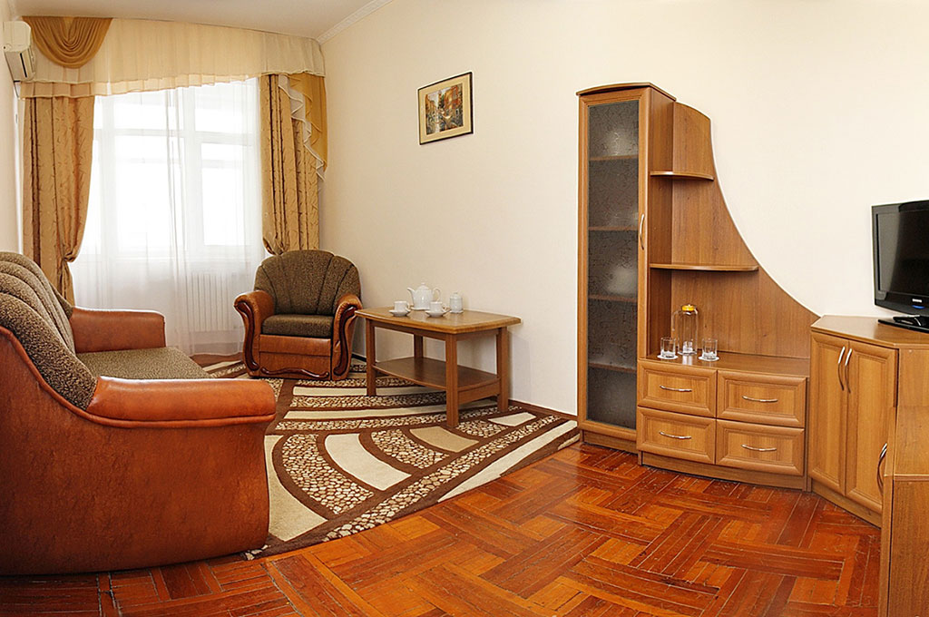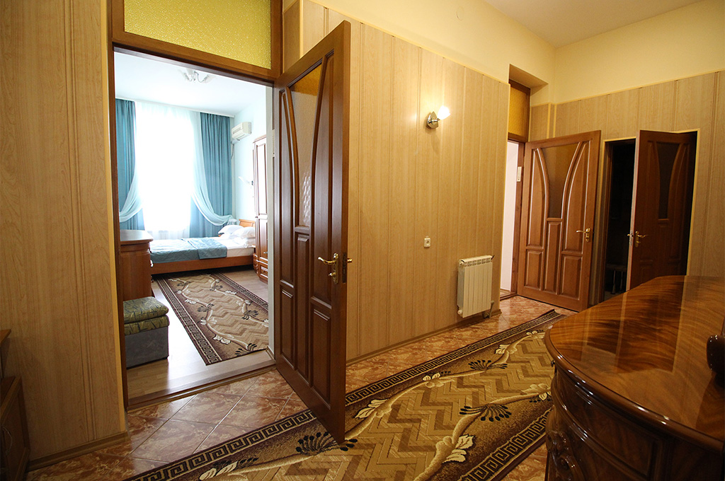 В номере: одна двуспальная кровать, две прикроватные тумбочки, платяной шкаф, журнальный столик, два пуфика, комплект посуды, трюмо, комплект летней мебели на балконе, сервант, диван, два кресла, сейф, телевизор (гостиная, спальная), холодильник, кондиционер, фен, электрический чайник, 3 полотенца (1 банное, 1 среднее, 1 маленькое).