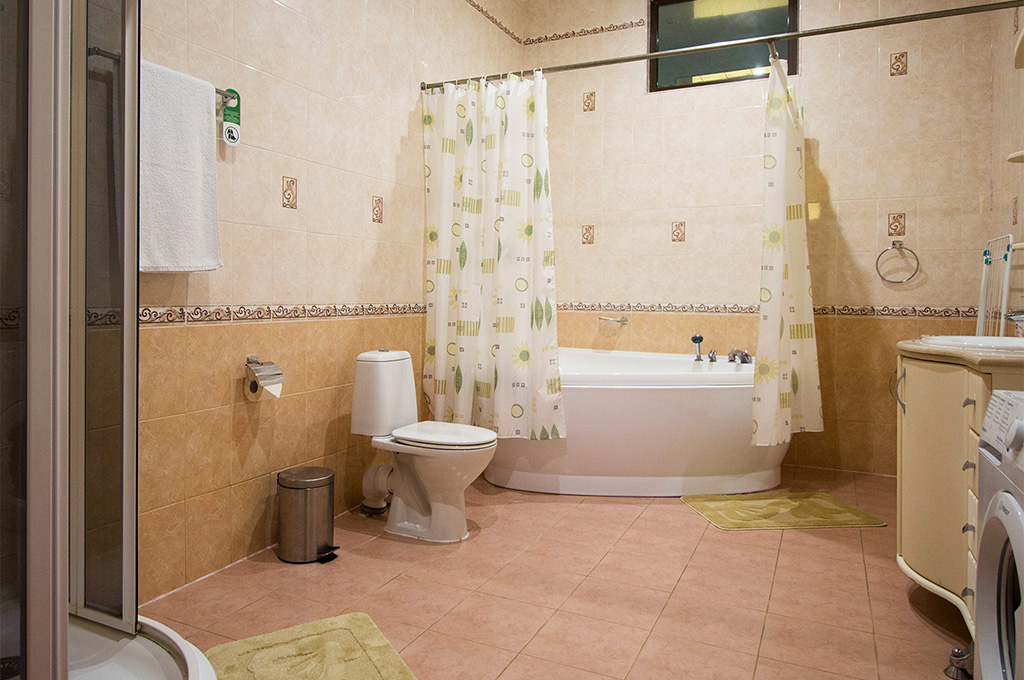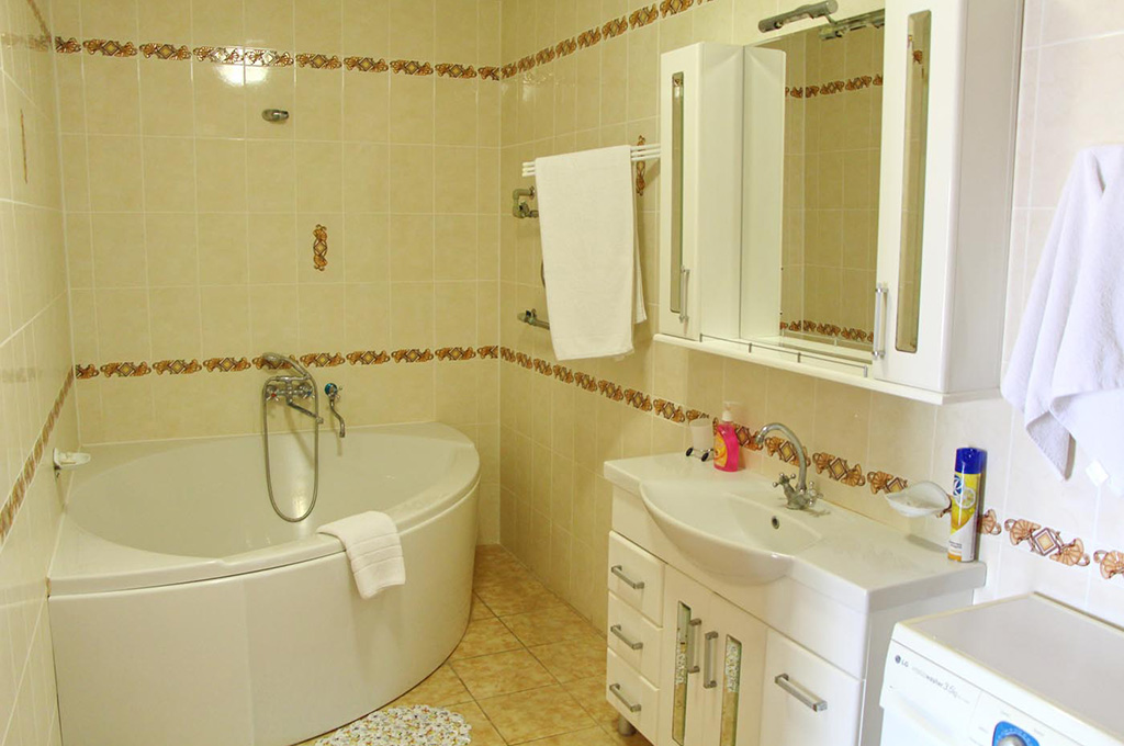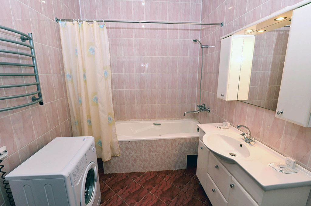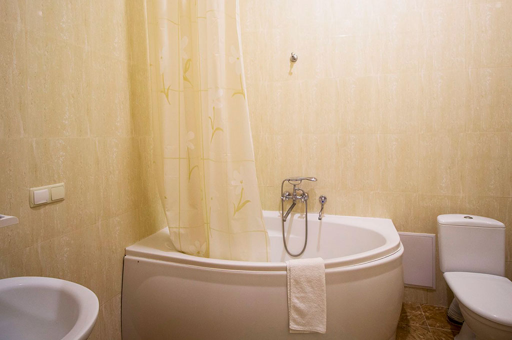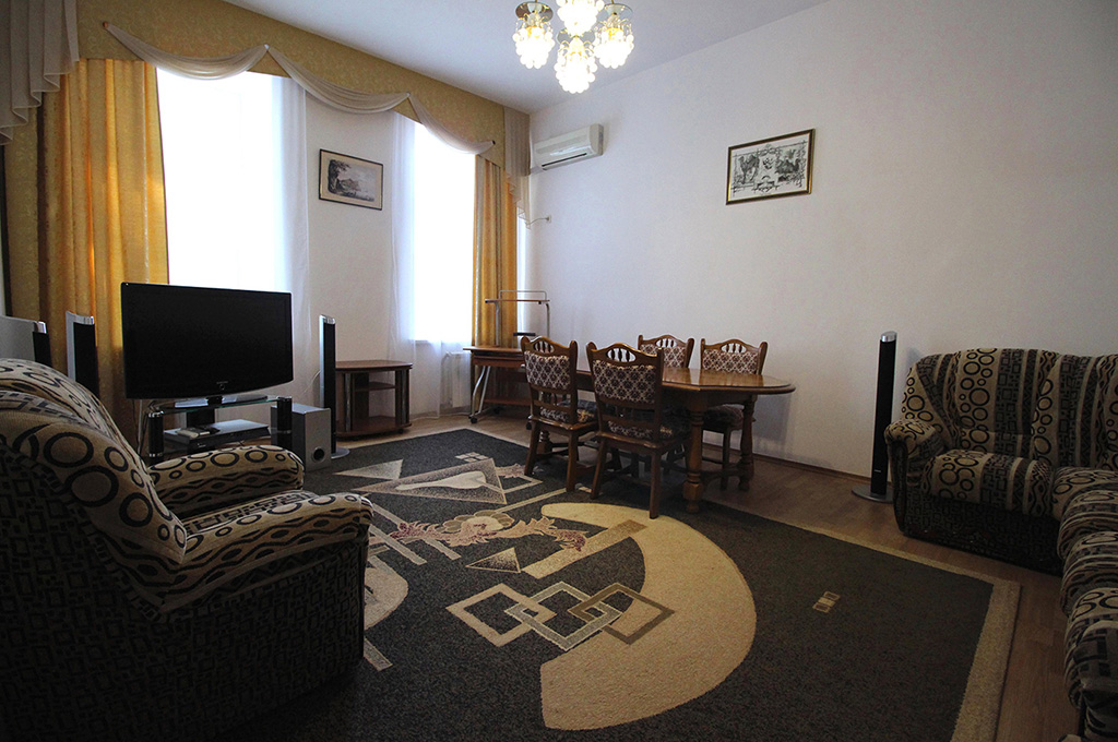 В номере: одна двуспальная кровать, две прикроватные тумбочки, платяной шкаф, журнальный столик, два пуфика, комплект посуды, трюмо, комплект летней мебели на балконе, сервант, диван, два кресла, сейф, телевизор (гостиная, спальная), холодильник, кондиционер, фен, электрический чайник, 3 полотенца (1 банное, 1 среднее, 1 маленькое).