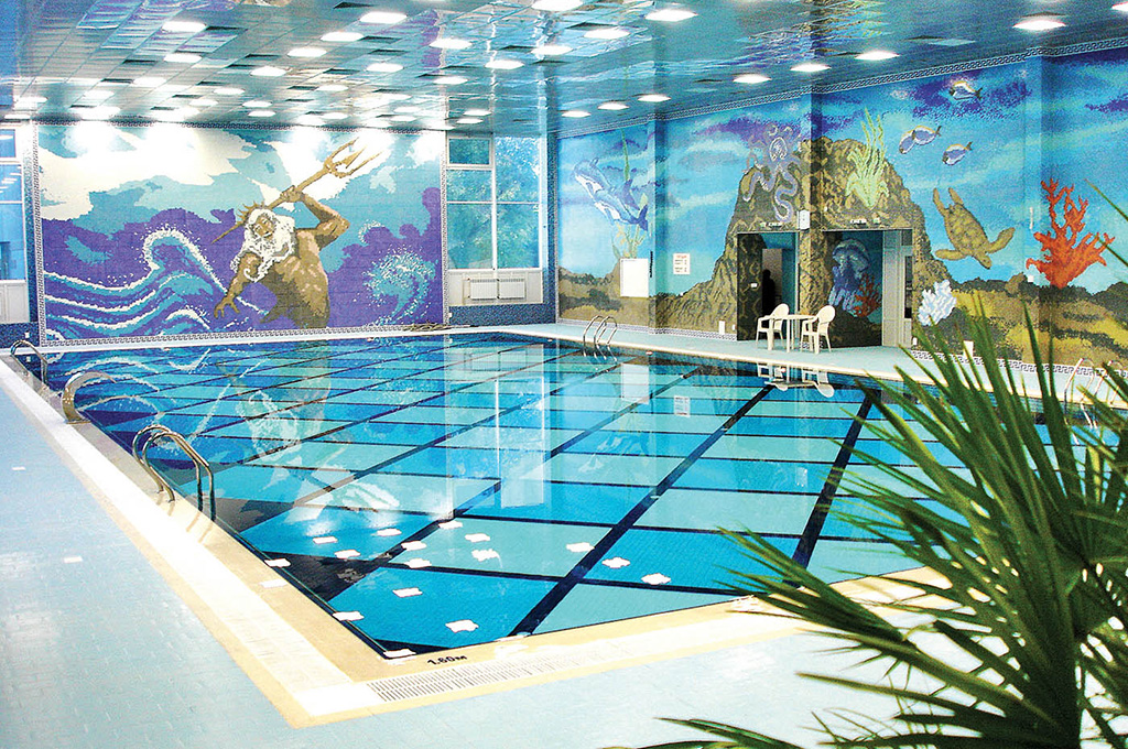 Крытый бассейн длиной 24 м, открытый летний бассейн, бассейн для гидрокинезотерапии, гидромассаж, водопад, аквагимнастика и лечебное плавание. Бассейны оснащены системой фильтрации, обеззараживания и подогрева воды